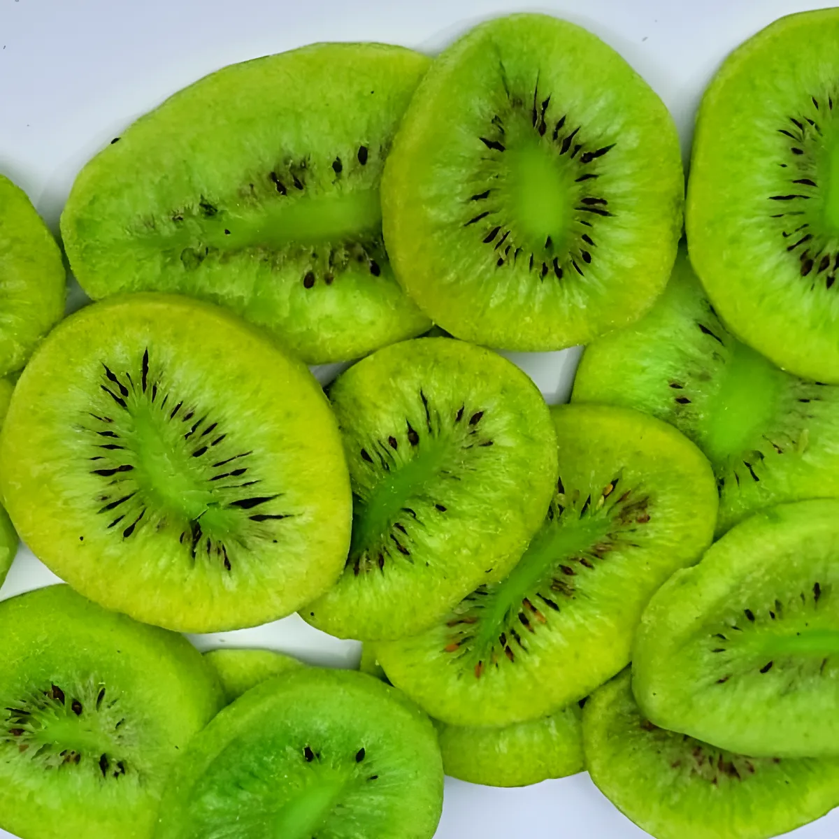 Processo de liofilização que preserva o sabor intenso e os nutrientes do kiwi fresco.